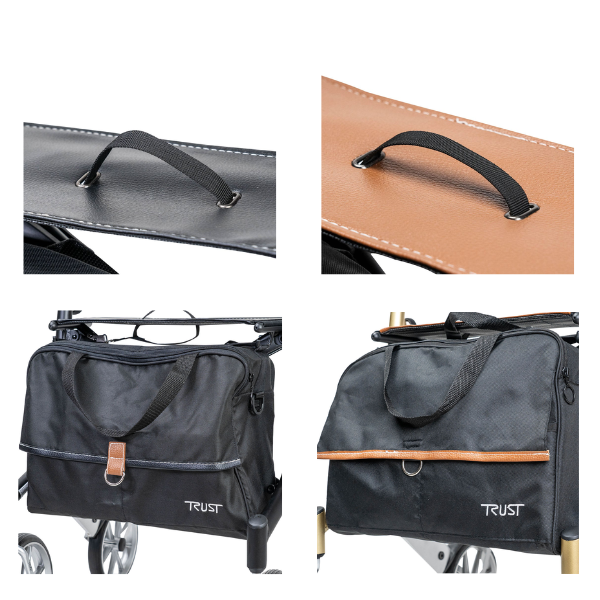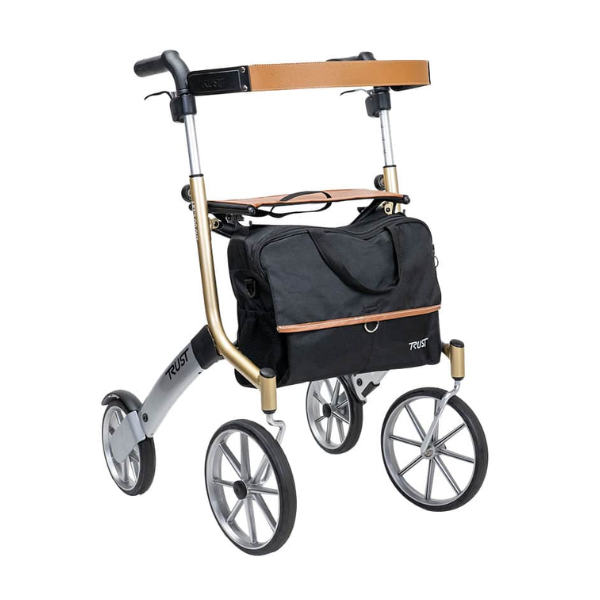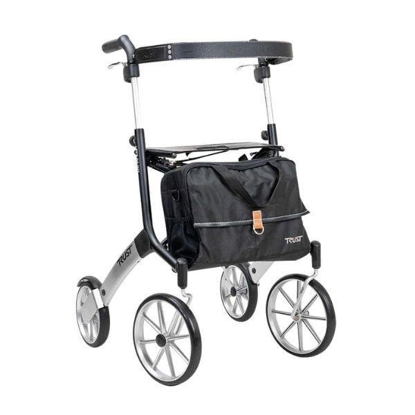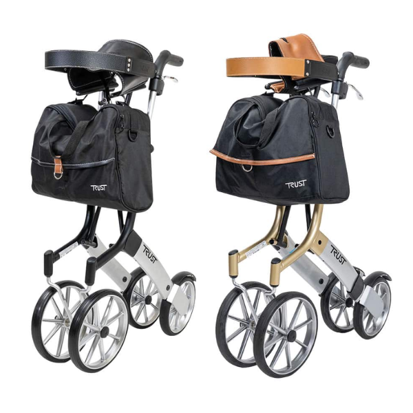 The Let's Go Out outdoor rollator is lightweight with a smooth, steady forward motion. Weighing only 6.4 kg (14 lbs), this outdoor rollator is easy to fold, needing very little space to transport and standing on its own when folded. The large front wheels make it easy to turn and cross sidewalk curbs. The rear wheel fenders protect the user's clothes from dirt and feature shock-absorbing suspension to help the rollator move smoothly on most surfaces. Available in black or beige