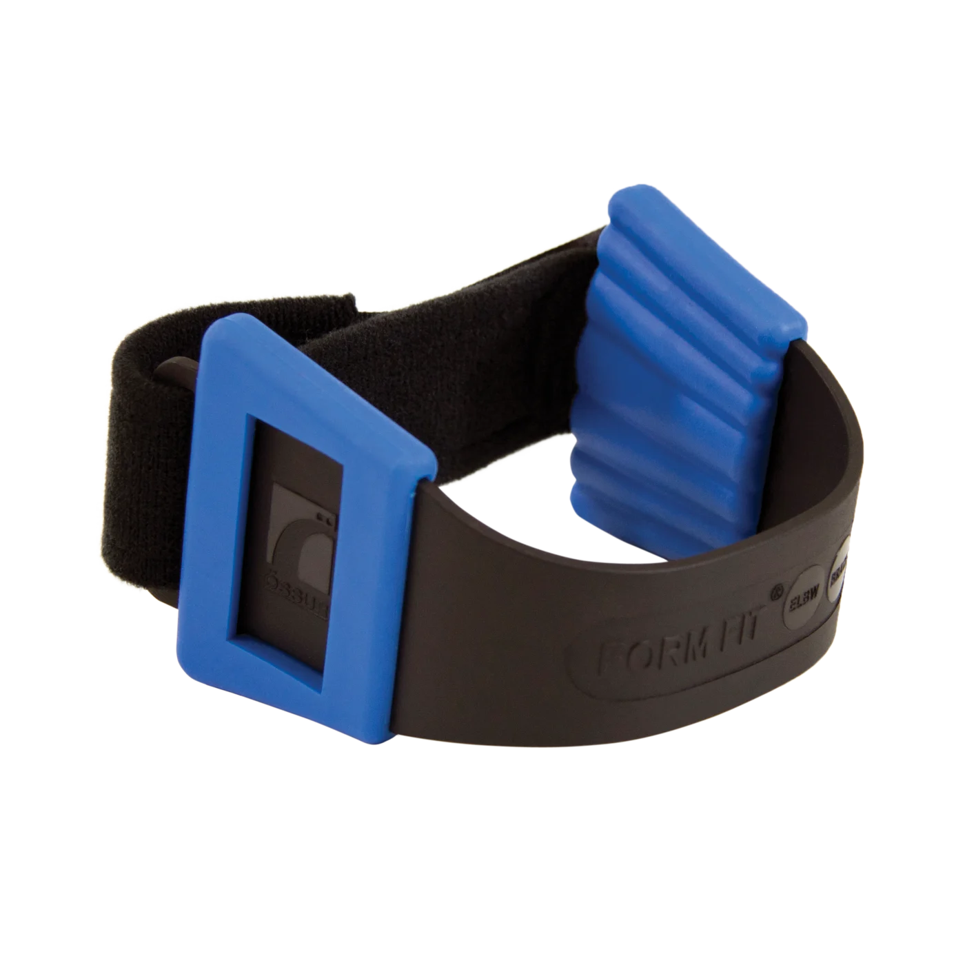 The Ossur Formfit Tennis Elbow Support is a durable and ergonomically designed brace that provides pain relief for tennis and golfer's elbow. The brace features two blue cushions with ribbed surfaces on each side that reduce traction on the tendons. The durable design and materials enable everyday use for both work and athletic activities.